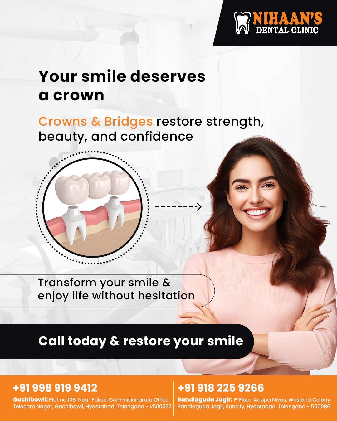Nihaan’s Dental Clinic in Bandlaguda Jagir offers comprehensive dental services including fillings, crowns, implants, and orthodontics. Our experienced team ensures painless, effective treatments. Call +91 9182509026 to schedule your consultation today!