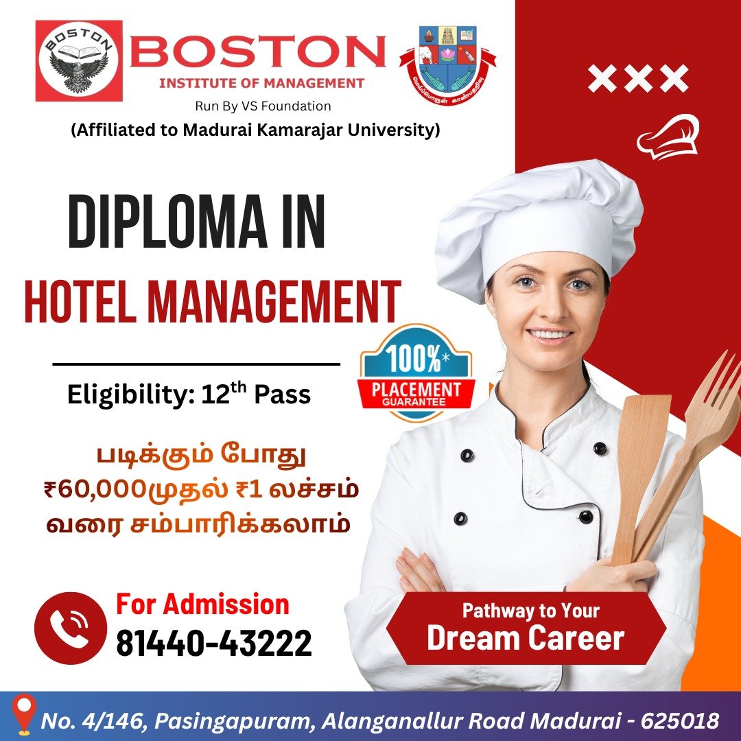 Boston College offers the Top Diploma in Hotel Management in Madurai, designed for students who want to build a successful career in hospitality, tourism, and food service. Recognized as the Best Hotel Management College in Madurai, we provide industry-focused training, modern facilities, and experienced faculty. As the Best Catering College in Madurai, Boston College delivers hands-on culinary practice, internship opportunities, and placement support in leading hotels and resorts. With our professional approach and reputation among culinary training institutes, students gain real-world skills, confidence, and global career readiness. Choose Boston College and begin your journey toward a rewarding hospitality career.